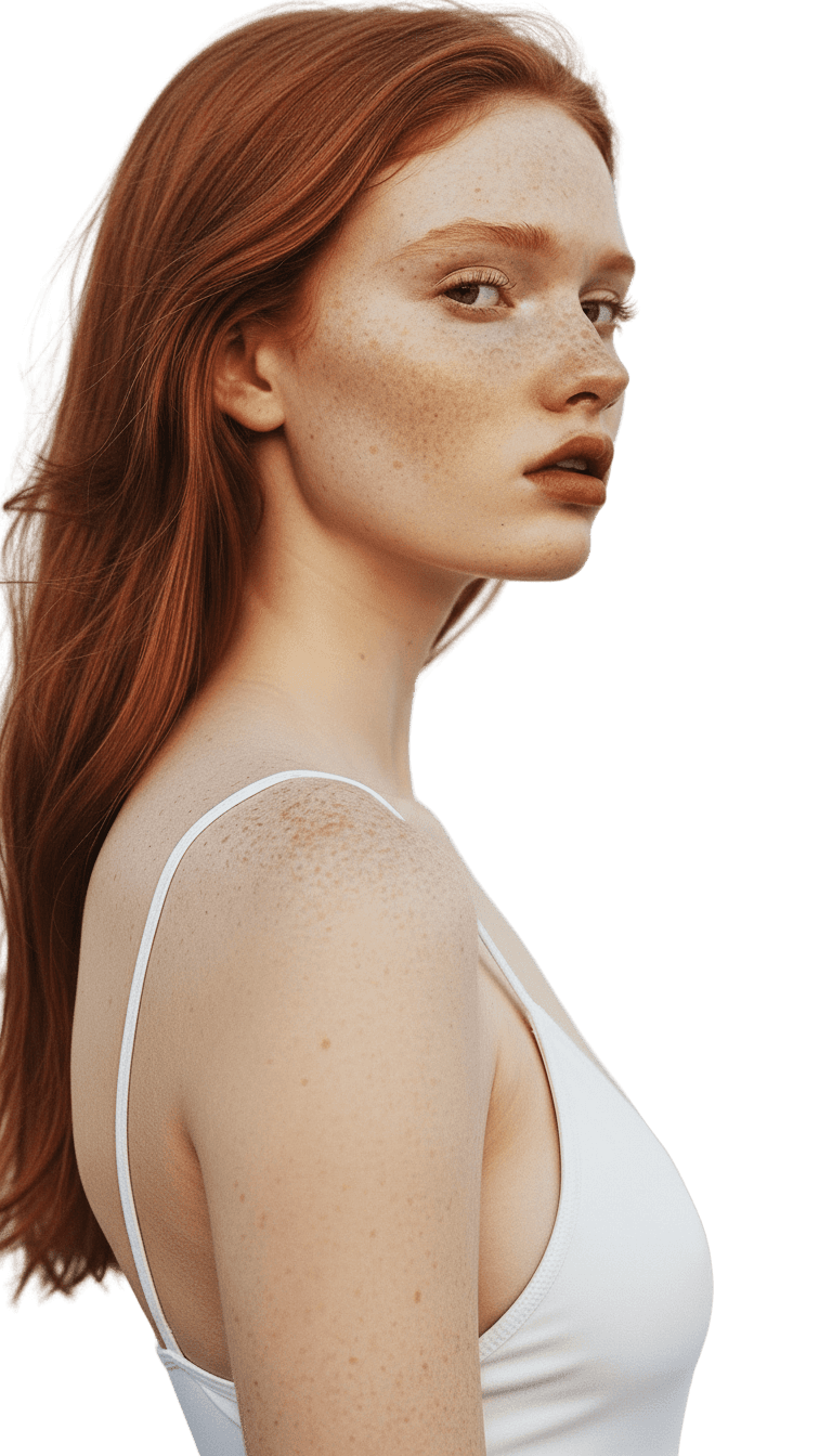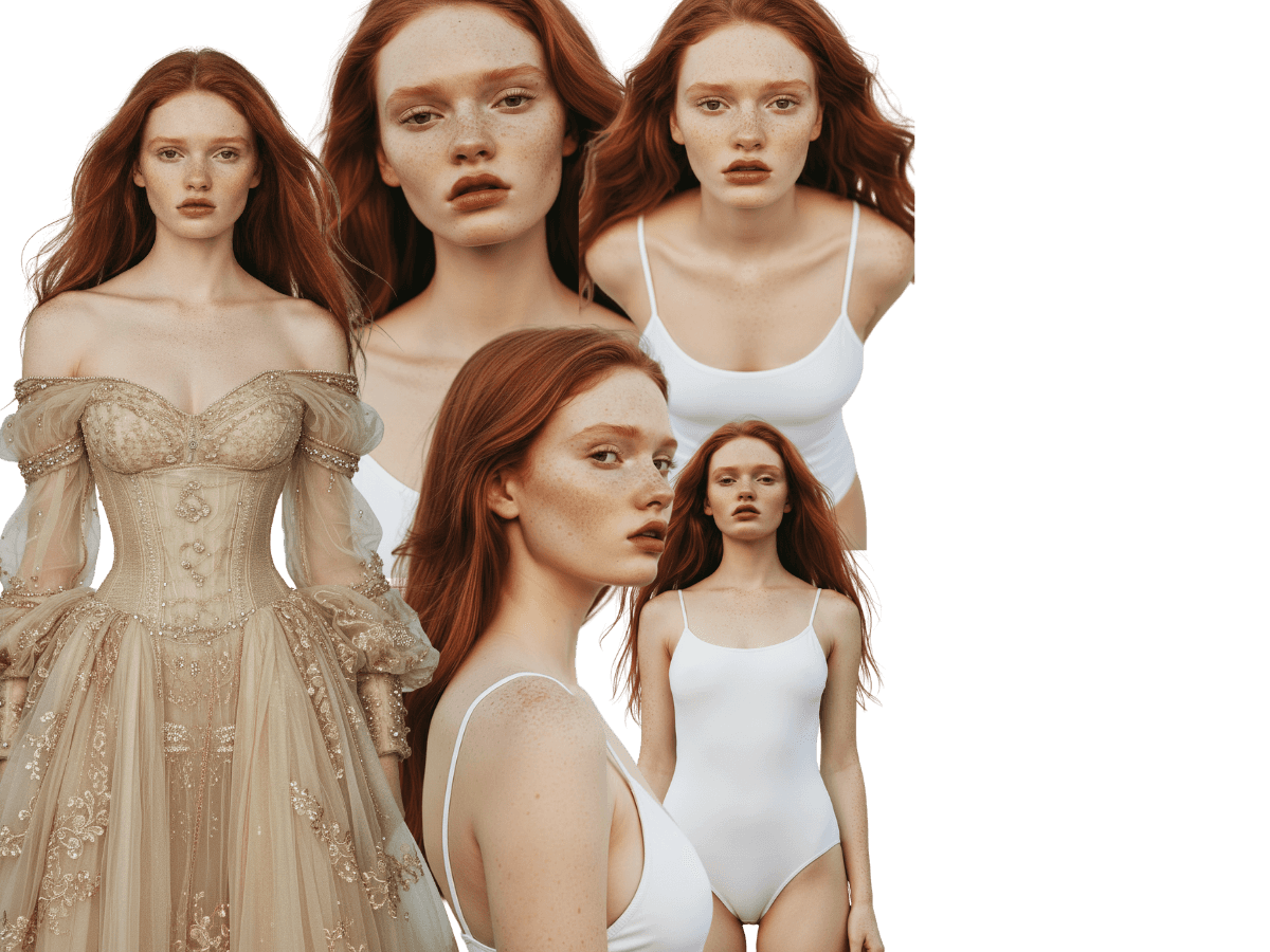 Генерація фото з продуктами, заміна одягу, робота з деталями шкіри, волосся та текстур. Фото виглядають як справжня комерційна зйомка.